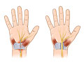 An incision is made at the base of the palm of the hand. This allows the doctor to see the transverse carpal ligament. After the ligament is cut, the skin is closed with stitches. The gap where the ligament was cut is left alone and eventually fills up with scar tissue.