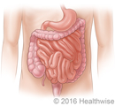 belly button (navel) and the breastbone. Some people also have back pain. The