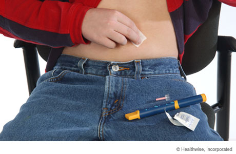prick yourself. Prime the needleslide 4 of 10 slide 4 of 10, Prime the needle, Before each shot, prime the needle. Priming removes air from the needle. Turn the dose knob to 2 units. Hold your pen with the needle pointing up. Tap the cartridge holder gently to move any air bubbles to the top. Push the injection button all the way in. Watch for a stream or drop of insulin to come out of the needle. If it does not, repeat this step again. Cleanslide 5 of 10 slide 5 of 10, Clean, Clean the area of skin where you will give the shot. If you use alcohol to clean the skin before you give the injection, let it dry. Pick a spotslide 6 of 10 slide 6 of 10, Pick a spot, Use a different spot each time you inject insulin. That's because using the same spot every time can cause bumps or pits to form in your skin. For example, inject your insulin above your belly button, then the next time use your upper thigh, and then the next time inject below your belly button. Stick itslide 7 of 10 slide 7 of 10, Stick it, Turn the dose knob to the number of units of insulin that you need to inject. Push the needle into your skin. Most people can inject using a 90-degree angle and without pinching the skin. Adults and children who are very lean and people who use longer needles may need to pinch the skin to avoid injecting into muscle. Inject and waitslide 8 of 10 slide 8 of 10, Inject and wait, Put your thumb on the injection button and push it in until it stops. Keep the pen in your skin. Hold the dose knob in for 10 seconds (or to the number that the manufacturer recommends). Then pull the needle out of your skin. Do not rub the area. Recapslide 9 of 10 slide 9 of 10, Recap, Put only the outer cap back over the needle. The thin, inner